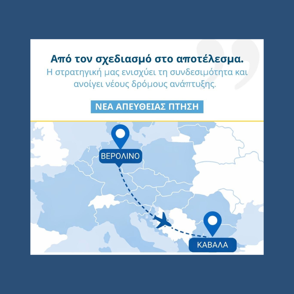 Στο πλαίσιο της οργανωμένης στρατηγικής που υλοποιεί για την ενίσχυση της αεροπορικής συνδεσιμότητας και την αναβάθμιση της Περιφέρειας ως σύγχρονου και ανταγωνιστικού τουριστικού προορισμού, καταγράφεται μία ακόμη θετική εξέλιξη, η προσθήκη νέας απευθείας αεροπορικής σύνδεσης Καβάλα – Βερολίνο από την Eurowings για τη θερινή περίοδο του 2026.